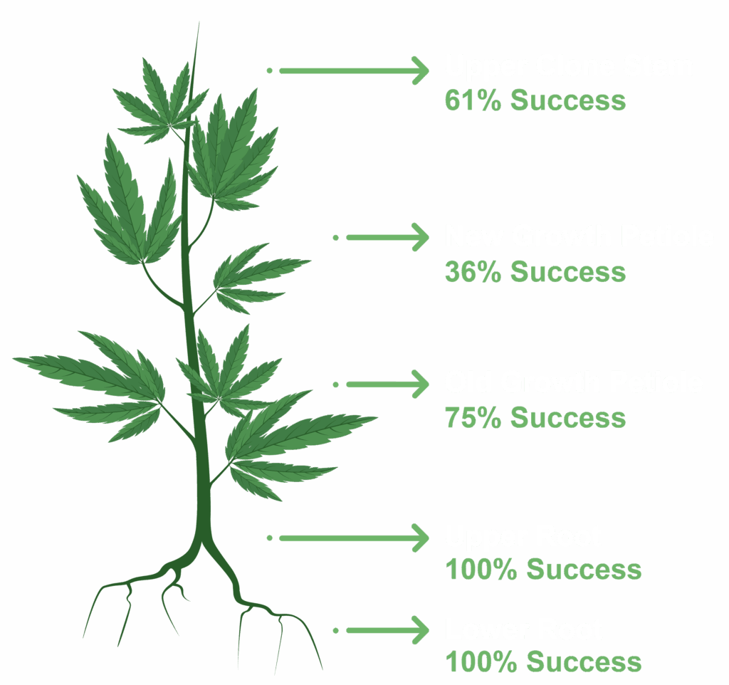 HLVd has been shown to transmit through seeds in hop plants at a rate of around 8% (11). In cannabis the percent transmission appear s to be quite a bit higher with transmission rates up to 80% for seedlings (12). TUMI Genomics internal studies suggest seed transmission rates range between 15% – 50% depending on cultivar and seed age.